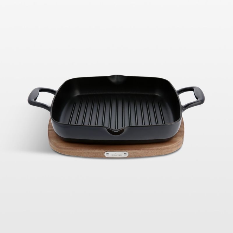 Cook short ribs, grilled cheese sandwiches, burgers and asparagus to perfection with this cast iron grill pan. Glossy on the exterior with a matte cooking surface, the black enamel finish resists stains and scratches. Durable cast iron heats steadily and evenly, requiring no pre-seasoning. Low walls allow for easy flipping, and extra-wide handles provide a sturdy grip even with pot holders or oven mitts. Raised ridges sear beautifully and release fat, which can be poured off easily using the spouts. Thanks to the included acacia wood trivet, the square pan goes effortlessly from the stove, oven or outdoor grill to the table.