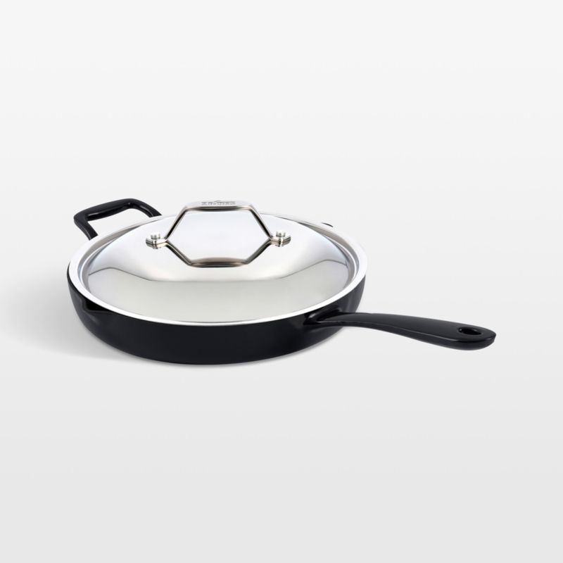 Designed to do it all, this skillet braises, fries, bakes and sautes. The cast iron distributes and holds heat evenly on the stovetop or in the oven—no seasoning required—while the black enamel finish resists scratches and stains. Straight, medium-height sides ably contain splatters, the stainless steel lid seals in heat and moisture, and the extra-wide handles provide a comfortable grip (even with oven mitts).