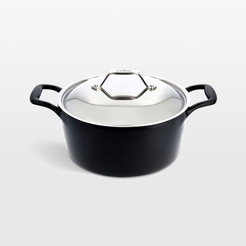 Designed to do it all, this Dutch oven braises, deep fries, bakes and stews. The cast iron distributes and holds heat evenly on the stovetop or in the oven—no seasoning required—while the black enamel finish resists scratches and stains. High sides make it easy to stir, the stainless steel lid seals in heat and moisture, and the extra-wide handles provide a comfortable grip (even with oven mitts).