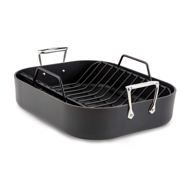 This nonstick roasting pan creates perfectly cooked meats, from a holiday turkey to a weeknight roast. High sides are ideal for preventing spills or splattering and the large, signature handles make for safe and convenient transport. The nonstick v-shaped rack allows air to circulate for even browning while allowing flavorful juices to pool for basting, glazing or a gravy base.