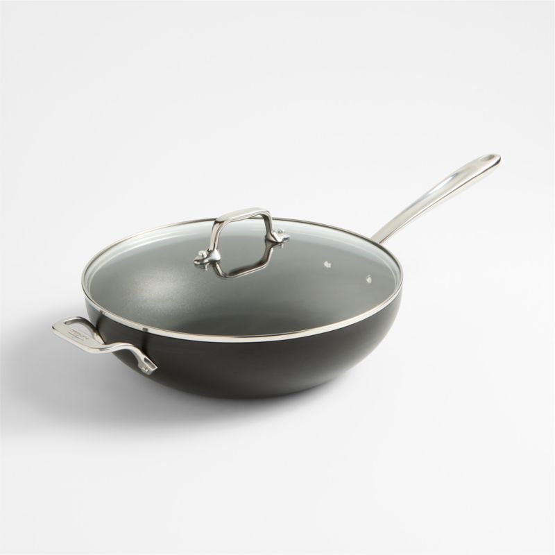 Cook like an expert. Anodized to absorb, distribute and transfer heat evenly and efficiently, this all-purpose chef's pan sautees onions, braises short ribs and bakes frittatas to perfection. The fast-heating aluminum pan boasts a stainless steel base that resists warping and heats evenly. Comfort-grip stainless steel handles provide a sturdy grip as you stir and flip, while flared sides allow for one-handed sauteing. Top with the glass lid to seal in heat and moisture. Three layers of durable non-stick finish ensure easy release and quick cleanup in the dishwasher.