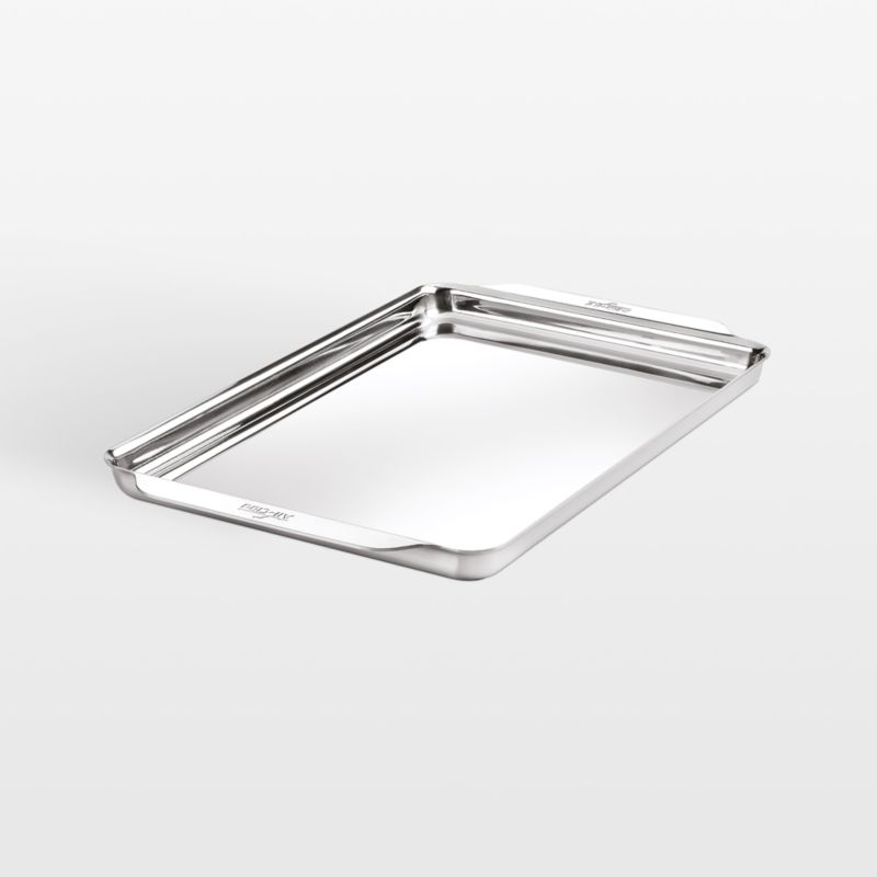 Perfect for baking cookies, roasting vegetables or warming up hor d'oeuvres, this sheet pan is made of durable, even-heating stainless steel with a heat-conductive aluminum core. Integrated handles provide a secure grip, and a low rim corrals contents. Oven- and broiler-safe to 600°F, the sturdy pan resists warping, creates uniform browning and offers consistent results.
