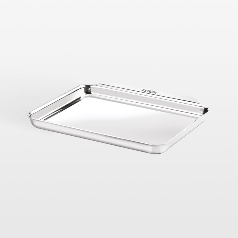 Perfect for baking cookies, roasting vegetables or warming up hor d'oeuvres, this sheet pan is made of durable, even-heating stainless steel with a heat-conductive aluminum core. Integrated handles provide a secure grip, and a low rim corrals contents. Oven- and broiler-safe to 600°F, the sturdy pan resists warping, creates uniform browning and offers consistent results.