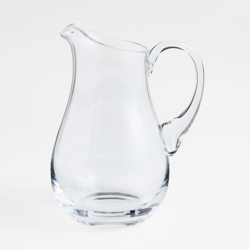 This handcrafted clear glass pitcher is perfect for lemonade or sangria, featuring an easy-to-pour curved handle and an ice lip to restrain wayward cubes or garnishes.