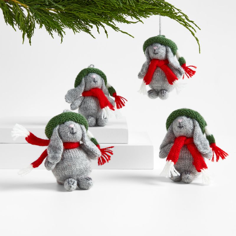 Alpaca Grey Bunny with Hat and Scarf Christmas Tree Ornament, Set of 4