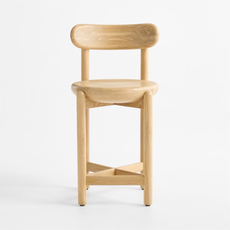 Our Amapa stools cut a strong silhouette with clean lines, comforting curves and a chic black finish. Detailed with radiused edges, the solid oak stool features a supportive rounded back and nests the semi-spherical seat within dowel legs rounded at both ends. Crossed stretchers add linear interest, while a single plank forms the footrest.