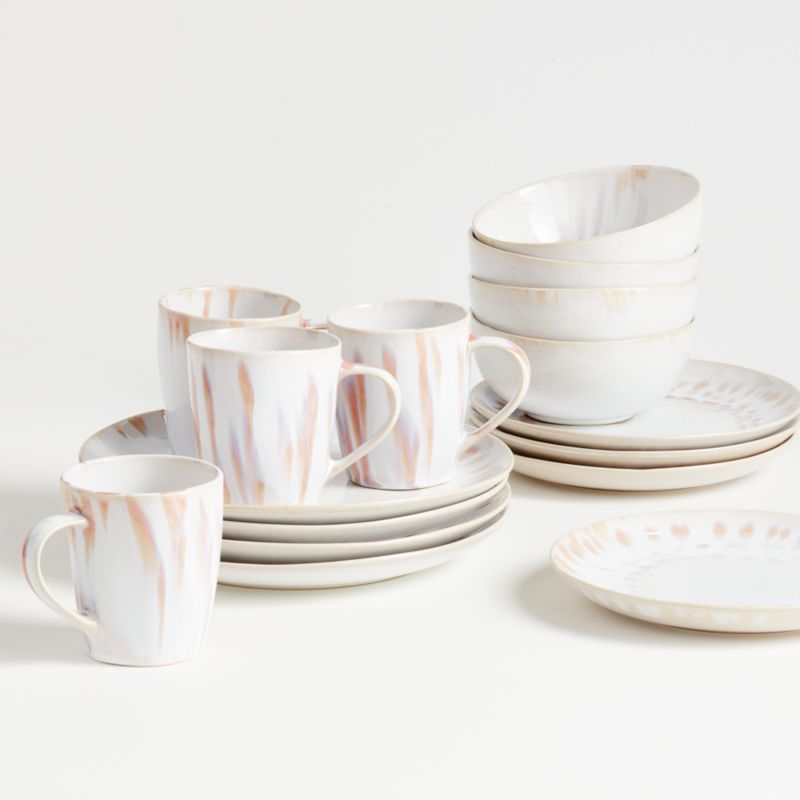 Earthy and ethereal shades of blush streak our exclusive Amina dinnerware and serving collection. Crafted in Portugal, the stoneware dishes feature two reactive glazes that create subtle shading and perfectly imperfect striations of pink, peach and blue on the milky ground. Each unique piece graces the table with soft hues and energetic artistry.