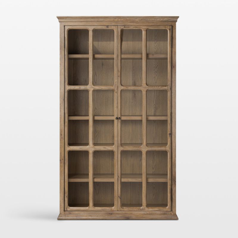 Amos updates the vintage charm of a barrister cabinet with soft curves and a weathered oak finish. Rounded mullions outline the tempered glass panes, providing a clear view of books, ceramics or collectibles displayed on the cabinet's five shelves. Crown and base molding anchor the look with timeless charm.