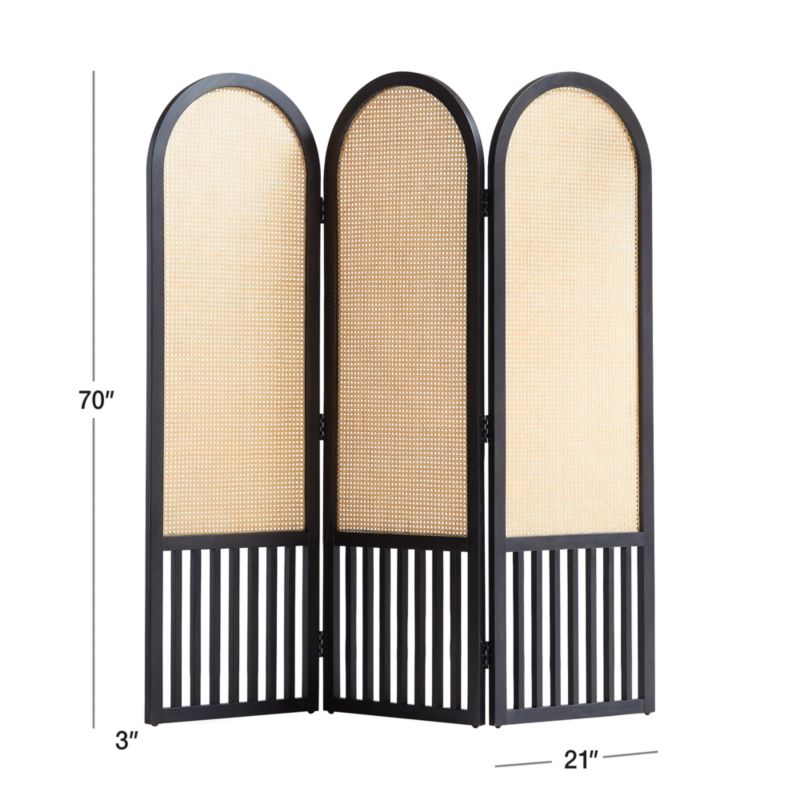Channeling 1930s curves and mid-century caning, our Anaise room divider screen flirts with tradition in an eye-catching design that's totally now. Mindi veneer rounds the frame, offering clean curves up top and a linear rhythm below. A black stain provides the perfect counterpoint to the warm color and woven texture of natural rattan caning. Use the adjustable screen to create a tropical-tinged cocktail corner, delineate spaces in a studio apartment or add a bold backdrop. Contemporary yet approachable, the room divider is part of Crate and Barrel's exclusive Anaise collection.