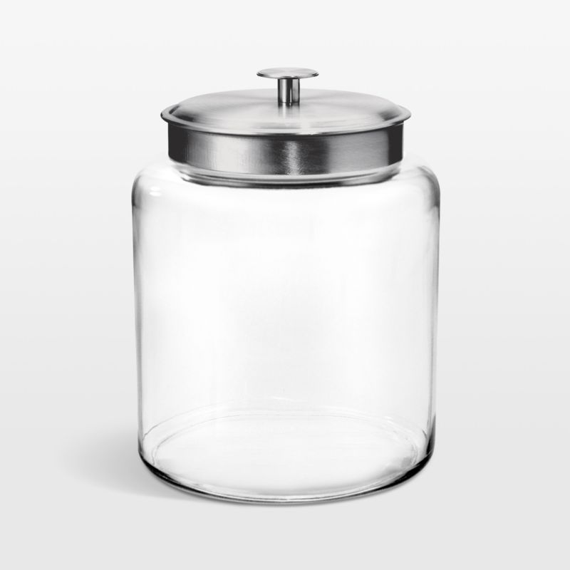 Roomy enough for flour, cookies, pasta and candy, the generously sized Montana jars from Anchor Hocking are a must-have for kitchen, pantry and countertop storage. The clear glass containers available in three sizes have wide mouths for easy access. Brushed aluminum lids have silicone gaskets for airtight storage and oversized knobs that make it convenient to pull off or push on.