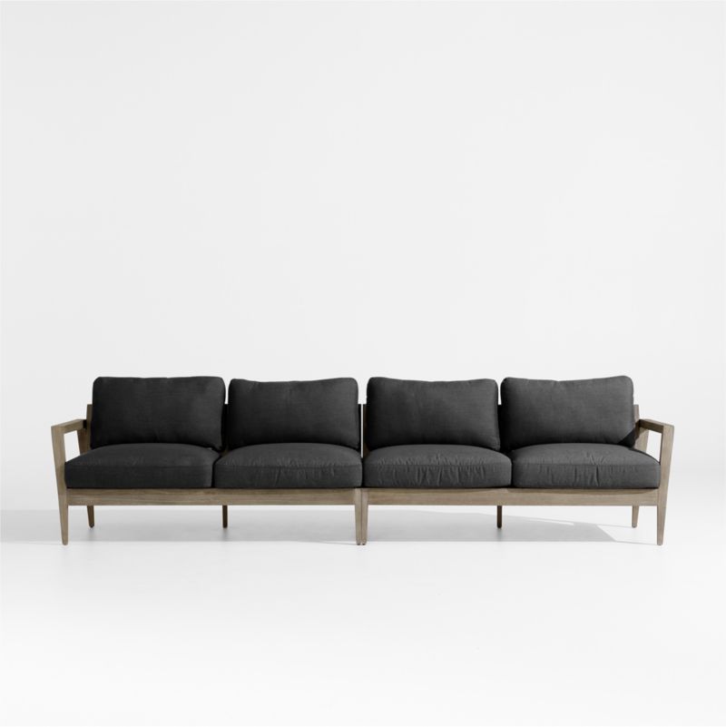 Our Andorra outdoor two-piece sectional owes its coastal cool vibe to fine workmanship and contemporary lines. Designed to look good from any view, the left- and right-arm sofas have clean-lined mahogany frames that play with geometry, flaring the armrests and setting the back legs at an eye-catching angle. Bentwood eucalyptus shapes the supportive backrests out of oversized slats. Wire brushing and a grey-brown finish replicate the look of sea-weathered wood, while weather-resistant charcoal grey seat and back cushions add an extra layer of stay-awhile comfort.