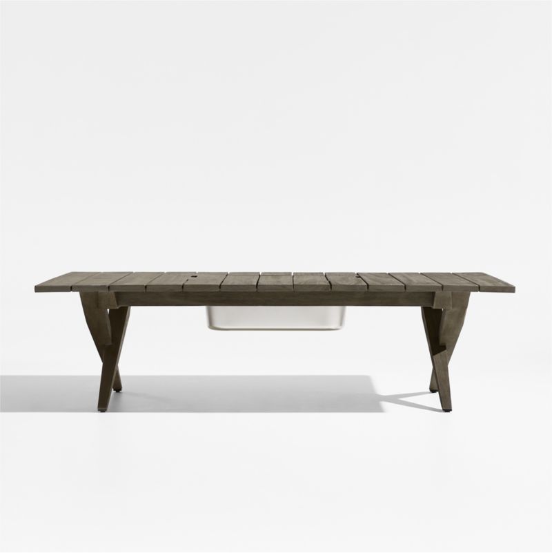 Andorra owes its coastal cool vibe to fine craftsmanship and contemporary lines. Primed for entertaining, the outdoor coffee table houses an inset stainless steel drink tub accessible by a removable top integrated into the slatted top. Reverse-tapered, lap-joined legs add to the table's contemporary silhouette. Made with sustainable wood—a mahogany base and eucalyptus slats—the table is finished with wire brushing and a grey-brown stain to resemble the natural patina of sea-weathered wood.
