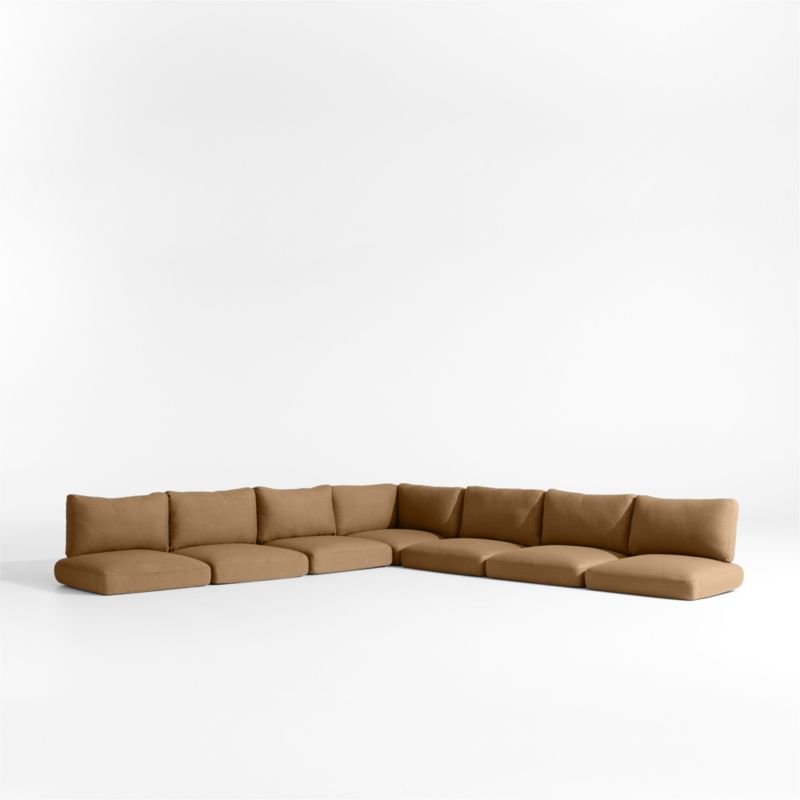 Our Andorra outdoor five-piece sectional owes its coastal cool vibe to fine workmanship and contemporary lines. Combining a corner and two armless chairs with left- and right-arm sofas, the L-shaped sectional features mahogany frames and wide-slatted backrests made of bentwood eucalyptus. Flaring arms, angled back legs and a pointed corner that resembles the bow of a ship make this a sofa that looks good at any angle. Wire brushing and a grey-brown finish replicate the look of sea-weathered wood, while weather-resistant white seat and back cushions add an extra layer of stay-awhile comfort.