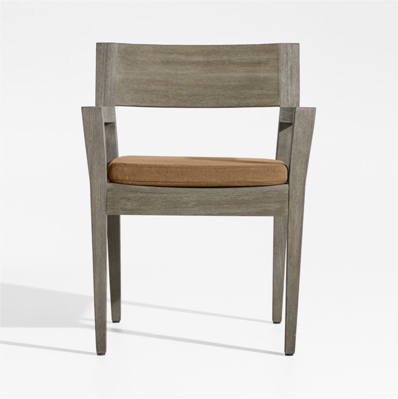 Inspired by a ship's graceful lines, the Andorra outdoor dining chair owes its coastal cool vibe to fine workmanship and contemporary lines. Designed to look good from any view, the clean-lined mahogany chair frame plays with geometry, flaring the armrests and setting the back legs at an eye-catching angle. Wire brushing and a grey-brown finish replicate the look of sea-weathered wood, while the weather-resistant white seat cushion adds an extra layer of stay-awhile comfort.