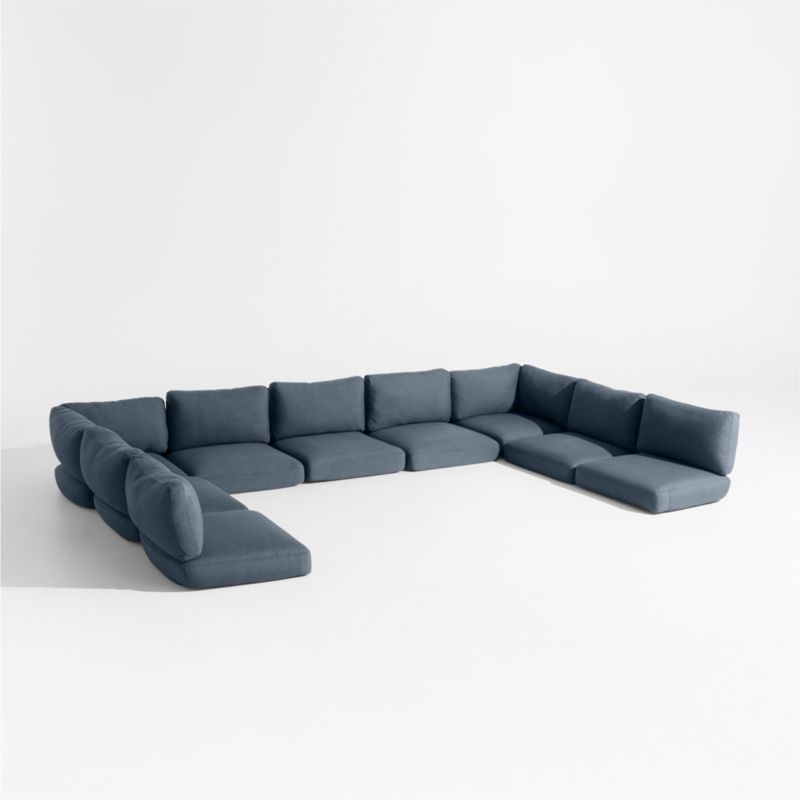 Our Andorra outdoor sectional sofa owes its coastal cool vibe to fine workmanship, contemporary lines and the luxurious comfort of its harbor blue cushions. Designed for the U-shaped sectional, the seat and back cushions are filled with plush and inviting polyfoam and fiber and upholstered in weather-resistant fabric. Simply attach via fabric-tab fasteners to the sofa frame (sold separately).