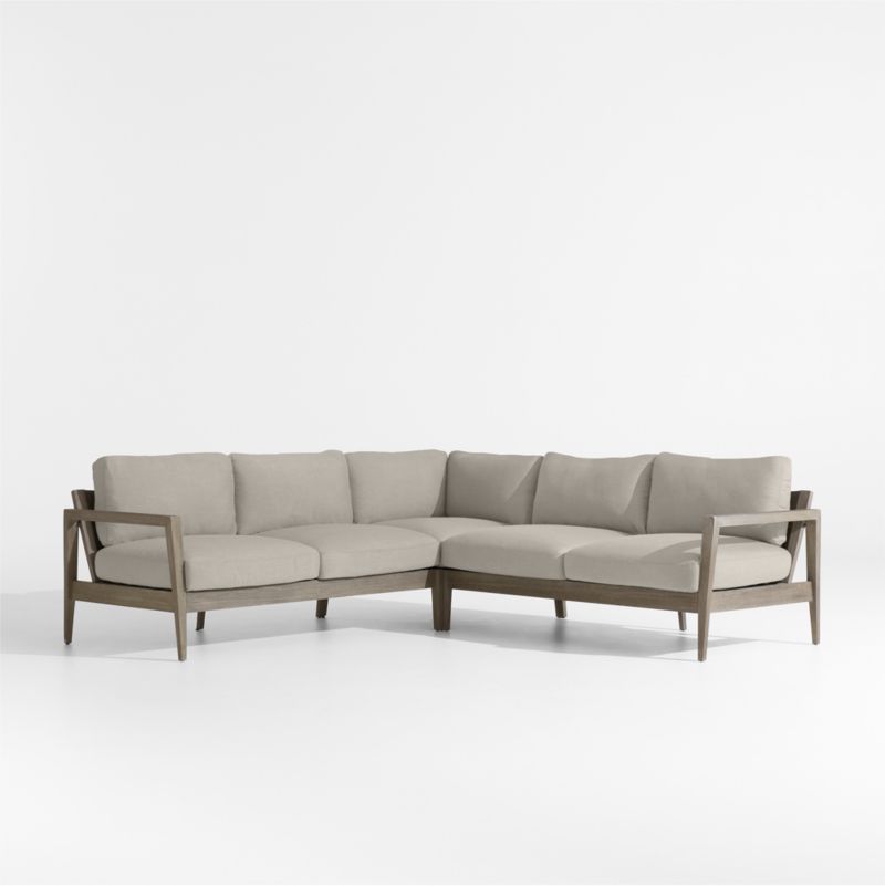 Our Andorra outdoor three-piece sectional owes its coastal cool vibe to fine workmanship and contemporary lines. Combining a corner with left- and right-arm sofas, the L-shaped sectional features mahogany frames and wide-slatted backrests made of bentwood eucalyptus. Flaring arms, angled back legs and a pointed corner that recalls the bow of a ship make this a sofa that looks good at any angle. Wire brushing and a grey-brown finish replicate the look of sea-weathered wood, while weather-resistant silver seat and back cushions add an extra layer of stay-awhile comfort.