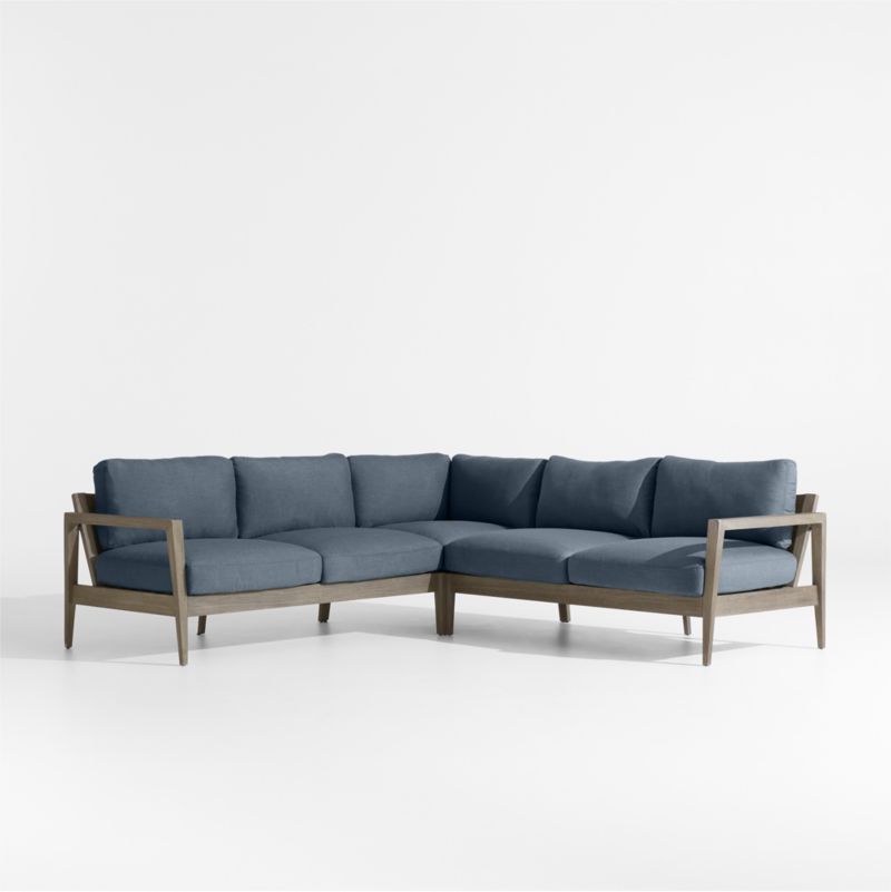 Our Andorra outdoor three-piece sectional owes its coastal cool vibe to fine workmanship and contemporary lines. Combining a corner with left- and right-arm sofas, the L-shaped sectional features mahogany frames and wide-slatted backrests made of bentwood eucalyptus. Flaring arms, angled back legs and a pointed corner that recalls the bow of a ship make this a sofa that looks good at any angle. Wire brushing and a grey-brown finish replicate the look of sea-weathered wood, while weather-resistant harbor blue seat and back cushions add an extra layer of stay-awhile comfort.