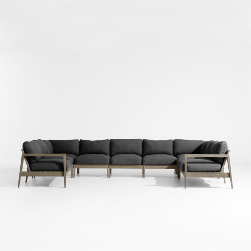 Our Andorra outdoor seven-piece sectional owes its coastal cool vibe to fine workmanship and contemporary lines. Combining two corners and three armless chairs with left- and right-arm sofas, the U-shaped sectional features mahogany frames and wide-slatted backrests made of bentwood eucalyptus. Flaring arms, angled back legs and pointed corners that resemble the bow of a ship make this a sofa that looks good at any angle. Wire-brushing and a grey-brown finish replicate the look of sea-weathered wood, while weather-resistant charcoal grey seat and back cushions add an extra layer of stay-awhile comfort.
