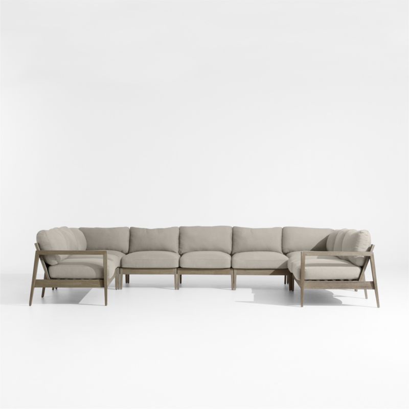 Our Andorra outdoor seven-piece sectional owes its coastal cool vibe to fine workmanship and contemporary lines. Combining two corners and three armless chairs with left- and right-arm sofas, the U-shaped sectional features mahogany frames and wide-slatted backrests made of bentwood eucalyptus. Flaring arms, angled back legs and pointed corners that resemble the bow of a ship make this a sofa that looks good at any angle. Wire-brushing and a grey-brown finish replicate the look of sea-weathered wood, while weather-resistant silver seat and back cushions add an extra layer of stay-awhile comfort.