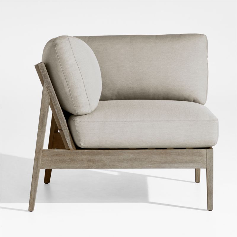 Our Andorra outdoor sectional owes its coastal cool vibe to fine workmanship and contemporary lines. Designed to look good from any view, the chair's mahogany frame resembles the bow of a ship with its pointed corner and slatted backrests made of bentwood eucalyptus. Legs set at an eye-catching angle continue the dynamic lines. Wire brushing and a grey-brown finish replicate the look of sea-weathered wood, while a weather-resistant taupe seat-and-back cushion adds an extra layer of stay-awhile comfort. To build a sectional sofa that's right for your space, combine the corner chair with your choice of other sectional components.