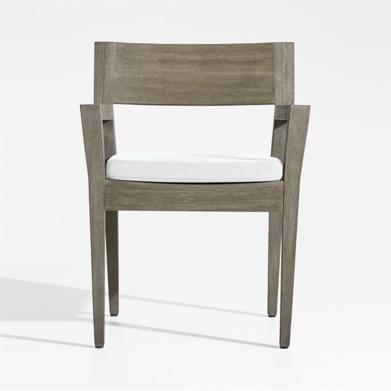 Inspired by a ship's graceful lines, the Andorra outdoor dining chair owes its coastal cool vibe to fine workmanship and contemporary lines. Designed to look good from any view, the clean-lined mahogany chair frame plays with geometry, flaring the armrests and setting the back legs at an eye-catching angle. Wire brushing and a grey-brown finish replicate the look of sea-weathered wood, while the weather-resistant white seat cushion adds an extra layer of stay-awhile comfort.