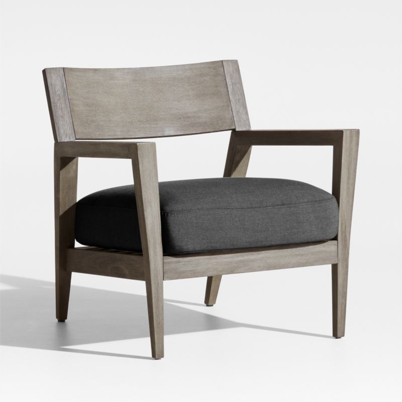 Inspired by a ship's graceful lines, the Andorra outdoor lounge chair owes its coastal cool vibe to fine workmanship and contemporary lines. Designed to look good from any view, the mahogany chair plays with geometry, flaring the armrests and setting the back legs at an eye-catching angle. Bentwood eucalyptus shapes supportive backrest out of molded, oversized slats. Wire brushing and a grey-brown finish replicate the look of sea-weathered wood, while the weather-resistant charcoal grey seat and back cushions add an extra layer of stay-awhile comfort.