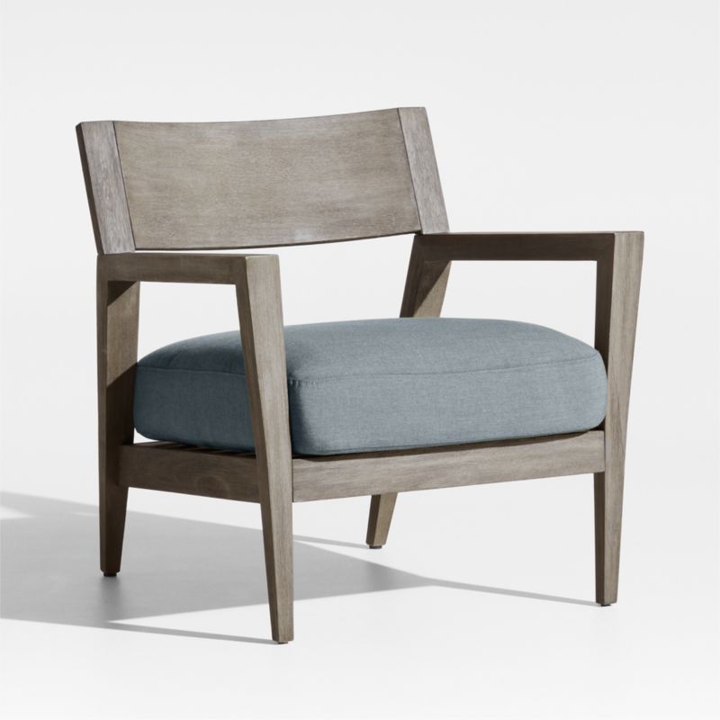 Inspired by a ship's graceful lines, the Andorra outdoor lounge chair owes its coastal cool vibe to fine workmanship and contemporary lines. Designed to look good from any view, the mahogany chair plays with geometry, flaring the armrests and setting the back legs at an eye-catching angle. Bentwood eucalyptus shapes supportive backrest out of molded, oversized slats. Wire brushing and a grey-brown finish replicate the look of sea-weathered wood, while the weather-resistant haze grey seat and back cushions add an extra layer of stay-awhile comfort.