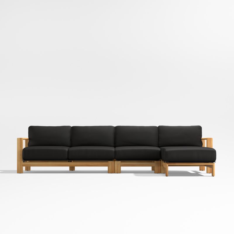 Our Anguilla three-piece sectional is a beautiful, worry-free place to spend lazy days outdoors. Exceptionally durable solid teak frames the sectionals angular silhouette, while thick, comfortable cushions covered in weather-resistant upholstery lull you into warm-weather bliss. Combining a right-arm chaise and left-arm sofa with an armless chair, the three-piece sectional sofa is crafted with roomy seats, solid construction and sleek lines for ideal patio or poolside lounging.
