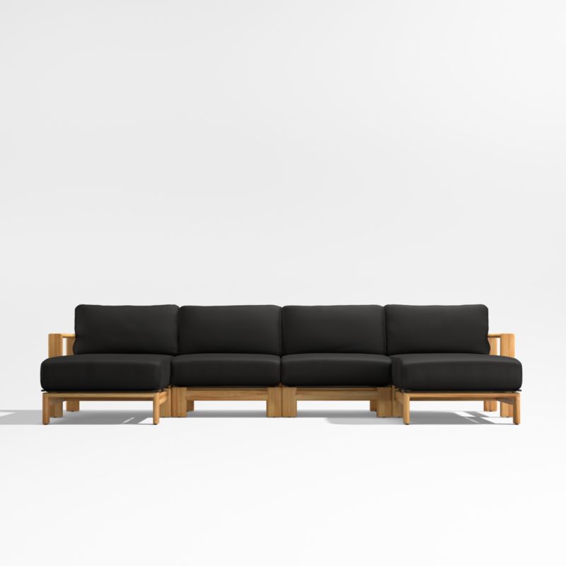 Our Anguilla double-chaise sectional is a beautiful, worry-free place to spend your lazy days. Exceptionally durable solid teak frames the sofa's angular silhouette, while thick, comfortable cushions covered in weather-resistant upholstery lull you into warm-weather bliss. The four-piece sectional sofa—right- and left-arm chaises and two armless chairs—is crafted with roomy seats, solid construction and sleek lines for ideal patio or poolside lounging.