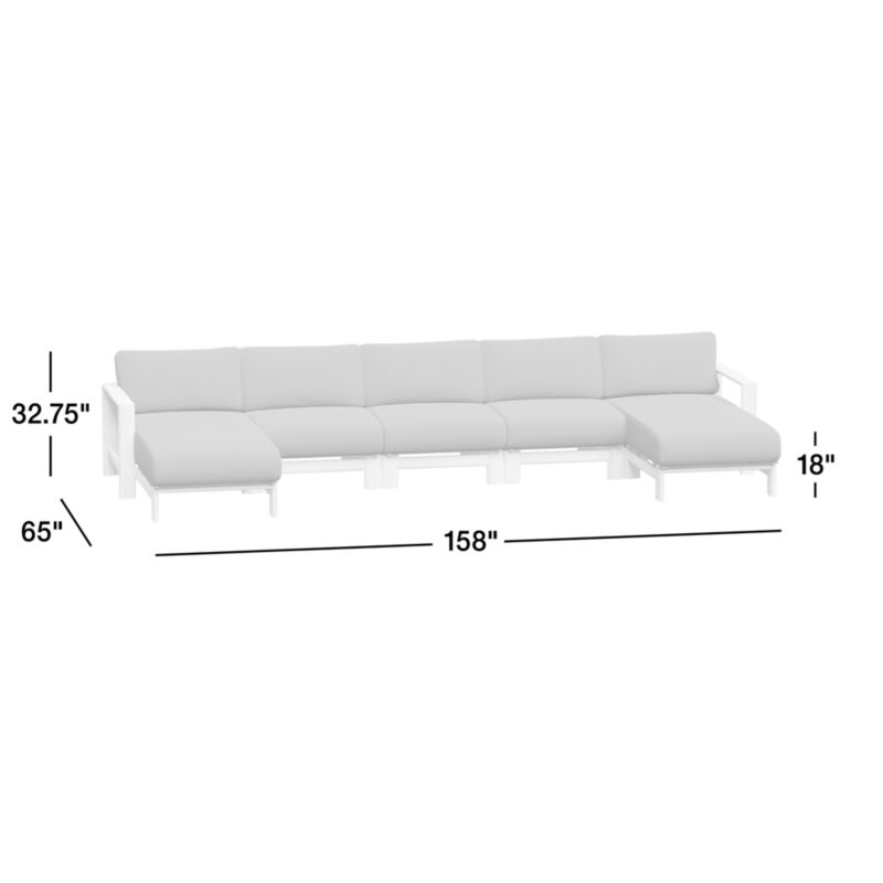 Our Anguilla double-chaise sectional is a beautiful, worry-free place to spend your lazy days. Exceptionally durable solid teak frames the sofa's angular silhouette, while thick, comfortable cushions covered in weather-resistant upholstery lull you into warm-weather bliss. The five-piece sectional sofa—right- and left-arm chaises and three armless chairs—is crafted with roomy seats, solid construction and sleek lines for ideal patio or poolside lounging.