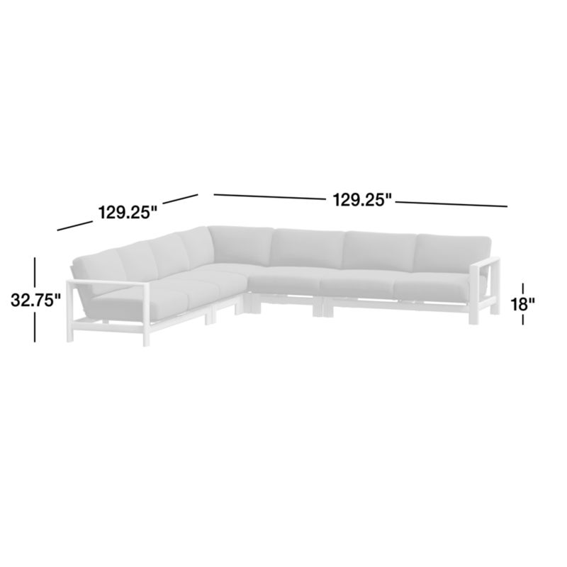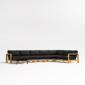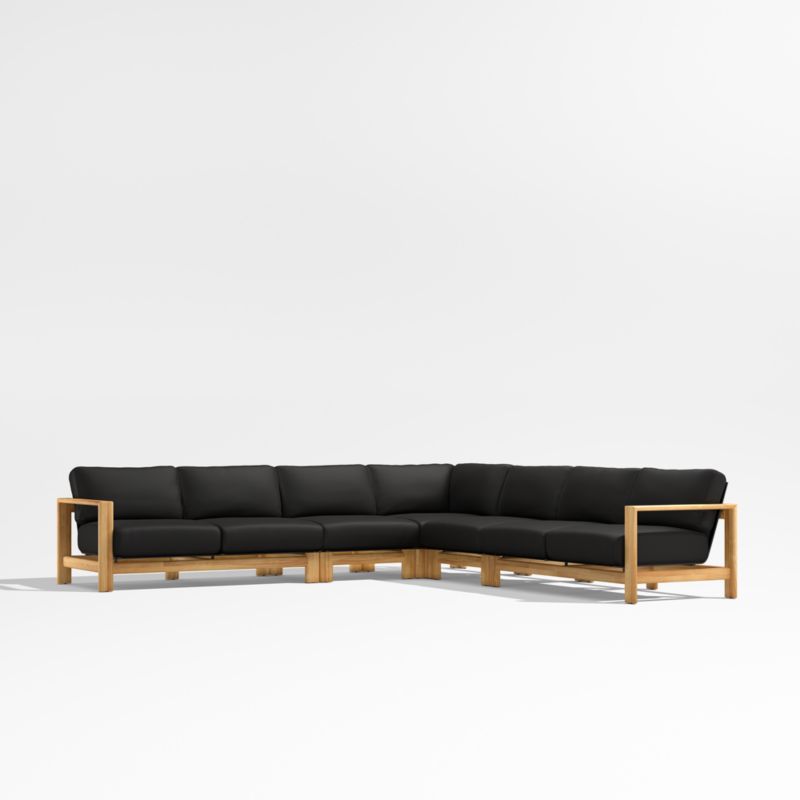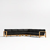 Our Anguilla five-piece sectional is a beautiful, worry-free place to spend lazy days outdoors. Exceptionally durable solid teak frames the sofa's angular silhouette, while thick, comfortable cushions covered in weather-resistant upholstery lull you into warm-weather bliss. The L-shaped sectional —right- and left-arm sofas, two armless chairs and a corner—is crafted with roomy seats, solid construction and sleek lines for ideal patio or poolside lounging.