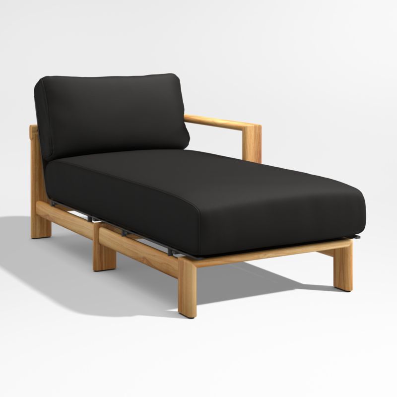 Our Anguilla outdoor sectional is a beautiful, worry-free place to spend your lazy days. Exceptionally durable solid teak frames the chaise's angular silhouette, while thick, comfortable cushions covered in weather-resistant upholstery lull you into warm-weather bliss. Crafted with solid construction and sleek lines, the right-arm chaise lounge combines with other sectional components to form a sofa that's ideal for patio or poolside relaxing.