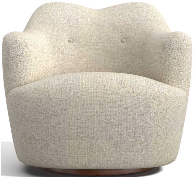Inspired by Swedish modern design, Apero pairs cozy curves with pillowy contours. The fully upholstered chair embraces with rounded arms that flow into a subtle camel back accented with two button tufts. The seat cushion wraps snuggly around the arms for curl-up comfort and a rounded silhouette. Providing a full 360 degrees of swivel, the round recessed plinth base lightens the look with a peek of oak veneer. Hugging all the softness is a durable fabric in light grey flecked with hints of tan and blue and woven like a fine Scottish tweed.