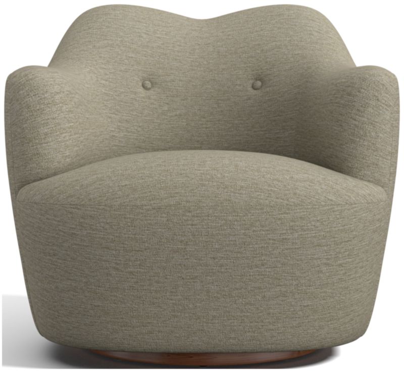 Inspired by Swedish modern design, Apero pairs cozy curves with pillowy contours. The fully upholstered chair embraces with rounded arms that flow into a subtle camel back accented with two button tufts. The seat cushion wraps snuggly around the arms for curl-up comfort and a rounded silhouette. Providing a full 360 degrees of swivel, the round recessed plinth base lightens the look with a peek of oak veneer. Hugging all the softness is a durable fabric in light grey flecked with hints of tan and blue and woven like a fine Scottish tweed.