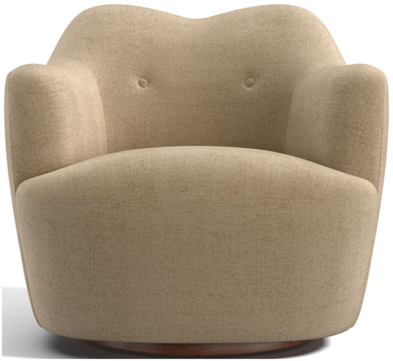 Inspired by Swedish modern design, Apero pairs cozy curves with pillowy contours. The fully upholstered chair embraces with rounded arms that flow into a subtle camel back accented with two button tufts. The seat cushion wraps snuggly around the arms for curl-up comfort and a rounded silhouette. Providing a full 360 degrees of swivel, the round recessed plinth base lightens the look with a peek of oak veneer. Hugging all the softness is a durable fabric in light grey flecked with hints of tan and blue and woven like a fine Scottish tweed.