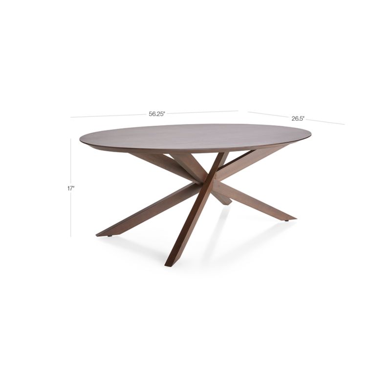 Exquisite solid walnut takes the finest form in Apex. This contemporary coffee table balances a slim reverse-beveled oval on a sculptural, crisscrossed base of notched and angled beams, creating a showpiece of design that's also functional.