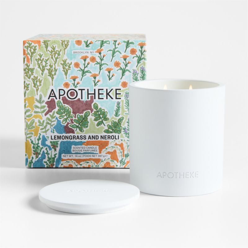 Apotheke's limited-edition garden collection brings the sweet scents of spring and summer home. Scented with perfume-grade oils, this double-wick candle wafts the essences of citrusy neroli and lemongrass. Jasmine and lily of the valley add floral sweetness, while cedar and sandalwood provide depth. The beautifully minimalist design of the white concrete lidded vessel and its vibrant box illustrated with the featured botanicals make this candle a luxurious gift.