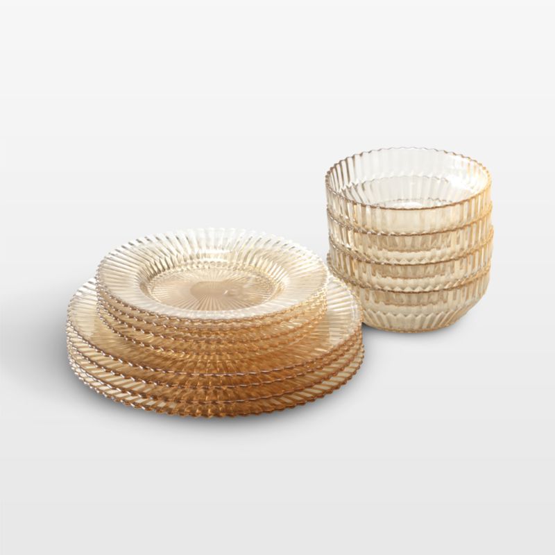 Our Archie glass dinnerware in ginger-inspired gold sparkles with a faceted pattern inspired by the Gothic architecture found in the Sardinian city of Alghero. The angled taper of the bowl and the pronounced rim of the plates add even more interest to the ribbing. Set an all-glass table with the four place settings of bowl, salad plate and dinner plates, or use individual pieces to layer with other dinnerware for extra dazzle.