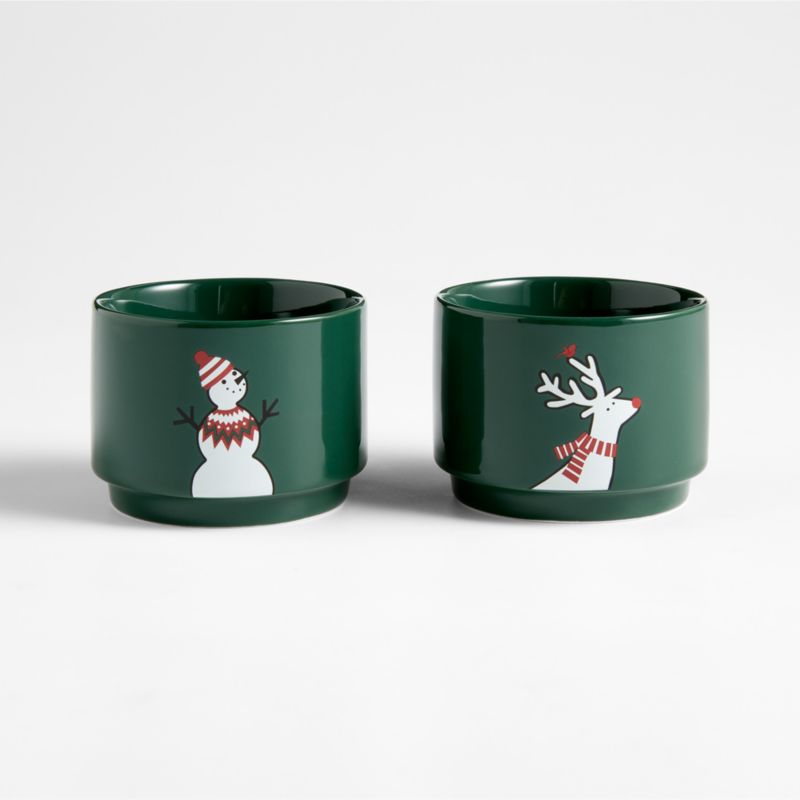 Joan Anderson's delightful holiday characters star on our deep evergreen ramekins. A red-nosed reindeer sports a candy cane-striped scarf—and a tiny red bird on its antlers—on one, while a snowman is bundled up in a cozy Fair Isle sweater on the other. Hand-glazed by skilled artisans, the two ceramic dishes bake and serve eggnog creme brulee, pot pies or cranberry souffle.