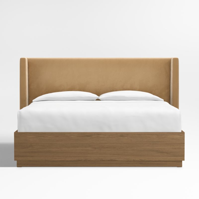 Our custom bed collection lets you mix and match our top-selling headboards and bases for a look that's truly yours. Upholstered in plush camel brown faux mohair with topstitched detailing, the Arden shelter headboard surrounds with wingback contours and comfy padding. The headboard wraps onto the Batten bed base, which complements Arden's tailored curves with a sleek plinth design and the lively grain of oak veneer enhanced with a smoke grey finish. A great choice for storage-challenged bedrooms, Batten seamlessly integrates a drawer at the foot of the base for placing bedding, blankets and out-of-season garments.