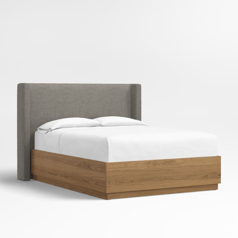 Our custom bed collection lets you mix and match our top-selling headboards and bases for a look that's truly yours. Fully upholstered in a soft bouclé weave in dark grey, the Arden headboard surrounds with wingback contours and comfy padding. The shelter headboard wraps onto the Batten bed base, which complements Arden's tailored curves with a sleek plinth design and the lively grain of oak veneer enhanced with a smoke grey finish. A great choice for storage-challenged bedrooms, Batten seamlessly integrates a drawer at the foot of the base for placing bedding, blankets and out-of-season garments.