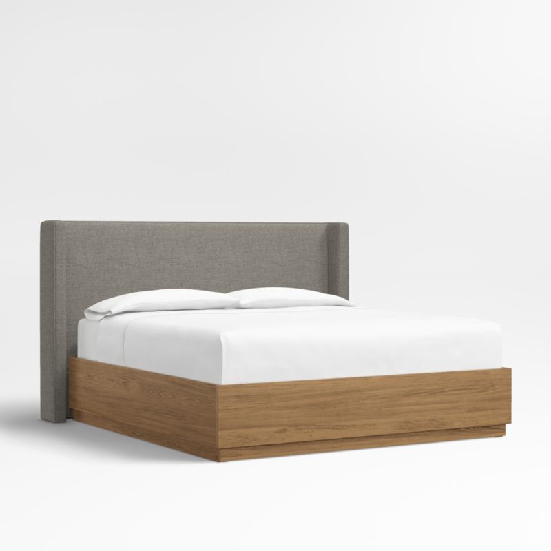 Our custom bed collection lets you mix and match our top-selling headboards and bases for a look that's truly yours. Fully upholstered in a soft bouclé weave in dark grey, the Arden headboard surrounds with wingback contours and comfy padding. The shelter headboard wraps onto the Batten bed base, which complements Arden's tailored curves with a sleek plinth design and the lively grain of oak veneer enhanced with a smoke grey finish. A great choice for storage-challenged bedrooms, Batten seamlessly integrates a drawer at the foot of the base for placing bedding, blankets and out-of-season garments.