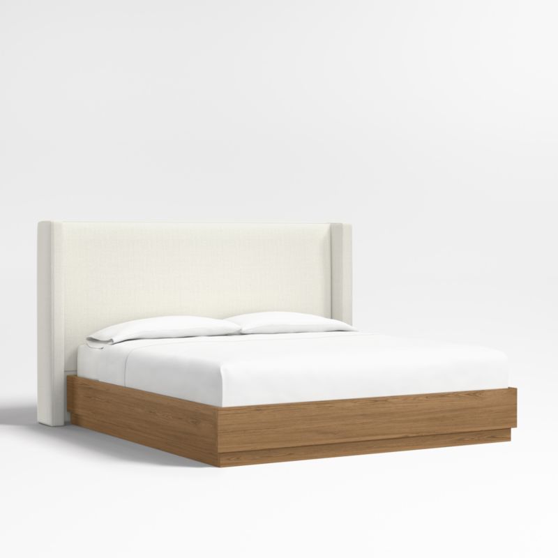 Our custom bed collection lets you mix and match our top-selling headboards and bases for a look that's truly yours. Upholstered in an ivory textured weave with topstitched detailing, the Arden shelter headboard surrounds with wingback contours and comfy padding. The headboard wraps onto the Batten bed base, which complements Arden's tailored curves with a sleek plinth design and the lively grain of oak veneer enhanced with a smoke grey finish.