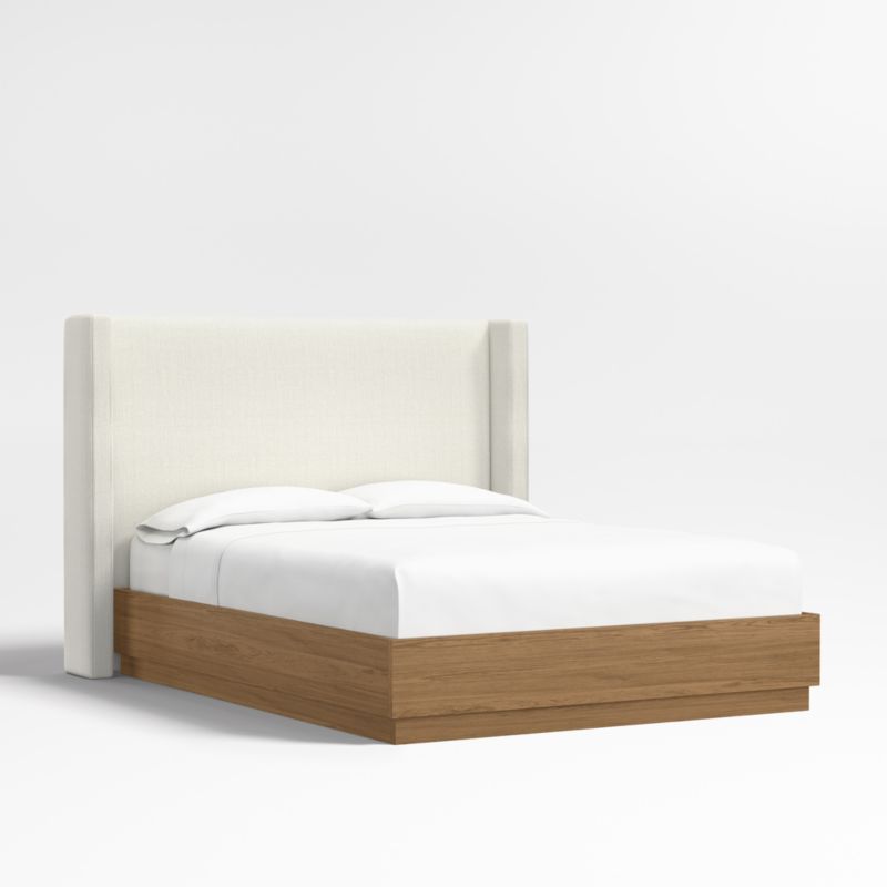 Our custom bed collection lets you mix and match our top-selling headboards and bases for a look that's truly yours. Upholstered in an ivory textured weave with topstitched detailing, the Arden shelter headboard surrounds with wingback contours and comfy padding. The headboard wraps onto the Batten bed base, which complements Arden's tailored curves with a sleek plinth design and the lively grain of oak veneer enhanced with a smoke grey finish.