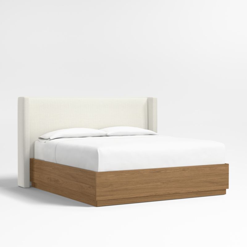 Our custom bed collection lets you mix and match our top-selling headboards and bases for a look that's truly yours. Upholstered in an ivory textured weave with topstitched detailing, the Arden shelter headboard surrounds with wingback contours and comfy padding. The headboard wraps onto the Batten bed base, which complements Arden's tailored curves with a sleek plinth design and the lively grain of oak veneer enhanced with a smoke grey finish. A great choice for storage-challenged bedrooms, Batten seamlessly integrates a drawer at the foot of the base for placing bedding, blankets and out-of-season garments.
