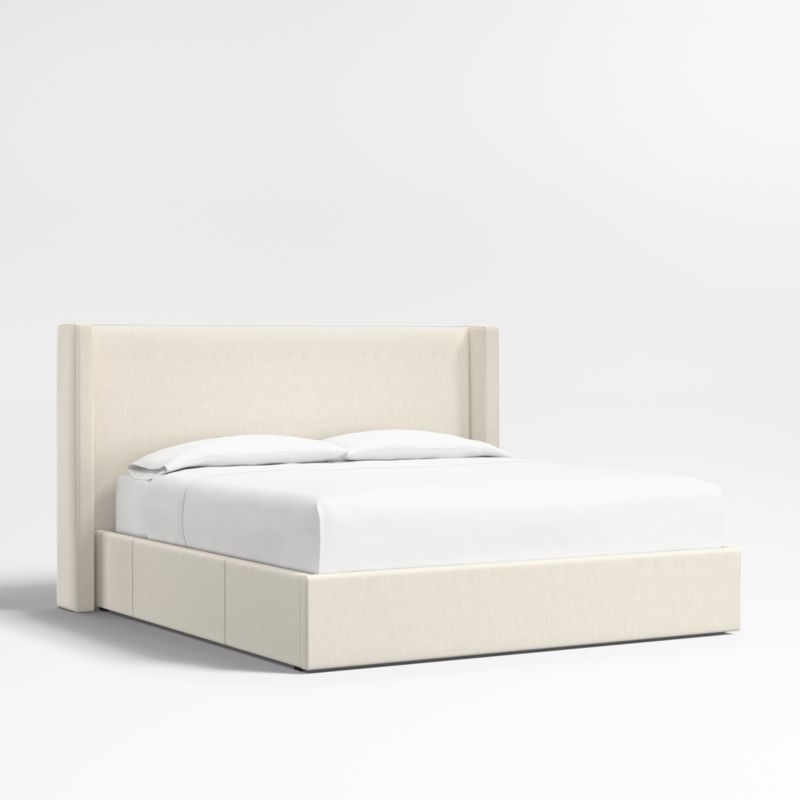 Our custom bed collection lets you mix and match our top-selling headboards and bases for a look that's truly yours. Fully upholstered in an ivory linen blend, our Arden headboard and storage base are amply padded and neatly tailored with topstitching. The shelter headboard with wingback contours and comfy padding wraps onto the base, which integrates three roomy drawers—one on each side and one at the foot of the bed—for storing off-season clothes and extra blankets. As a plus, the side drawers open with just enough clearance to avoid hitting nightstands and other bedroom furniture.