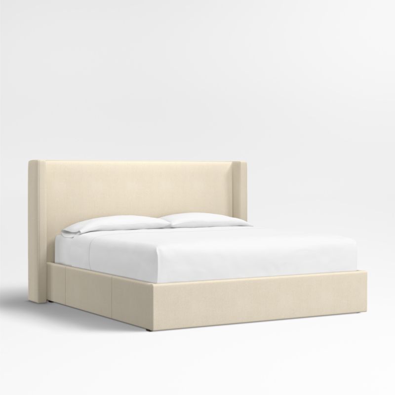 Our custom bed collection lets you mix and match our top-selling headboards and bases for a look that's truly yours. Fully upholstered in a soft bouclé weave in decor-friendly ivory, our Arden headboard and storage base are amply padded and neatly tailored with topstitching. The shelter headboard with wingback contours and comfy padding wraps onto the base, which integrates three roomy drawers—one on each side and one at the foot of the bed—for storing off-season clothes and extra blankets. As a plus, the side drawers open with just enough clearance to avoid hitting nightstands and other bedroom furniture.
