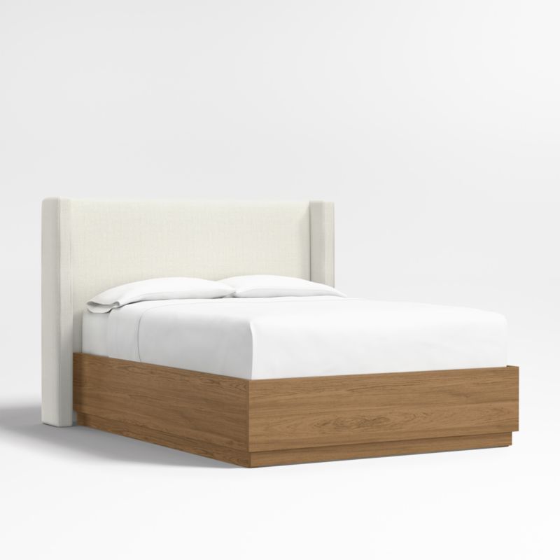 Our custom bed collection lets you mix and match our top-selling headboards and bases for a look that's truly yours. Upholstered in an ivory textured weave with topstitched detailing, the Arden shelter headboard surrounds with wingback contours and comfy padding. The headboard wraps onto the Batten bed base, which complements Arden's tailored curves with a sleek plinth design and the lively grain of oak veneer enhanced with a smoke grey finish. A great choice for storage-challenged bedrooms, Batten seamlessly integrates a drawer at the foot of the base for placing bedding, blankets and out-of-season garments.