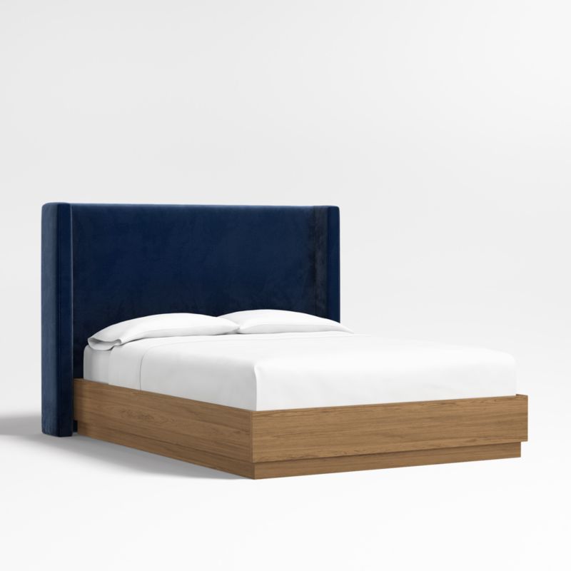 Our custom bed collection lets you mix and match our top-selling headboards and bases for a look that's truly yours. Upholstered in plush navy blue faux mohair with topstitched detailing, the Arden shelter headboard surrounds with wingback contours and comfy padding. The headboard wraps onto the Batten bed base, which complements Arden's tailored curves with a sleek plinth design and the lively grain of oak veneer enhanced with a smoke grey finish.