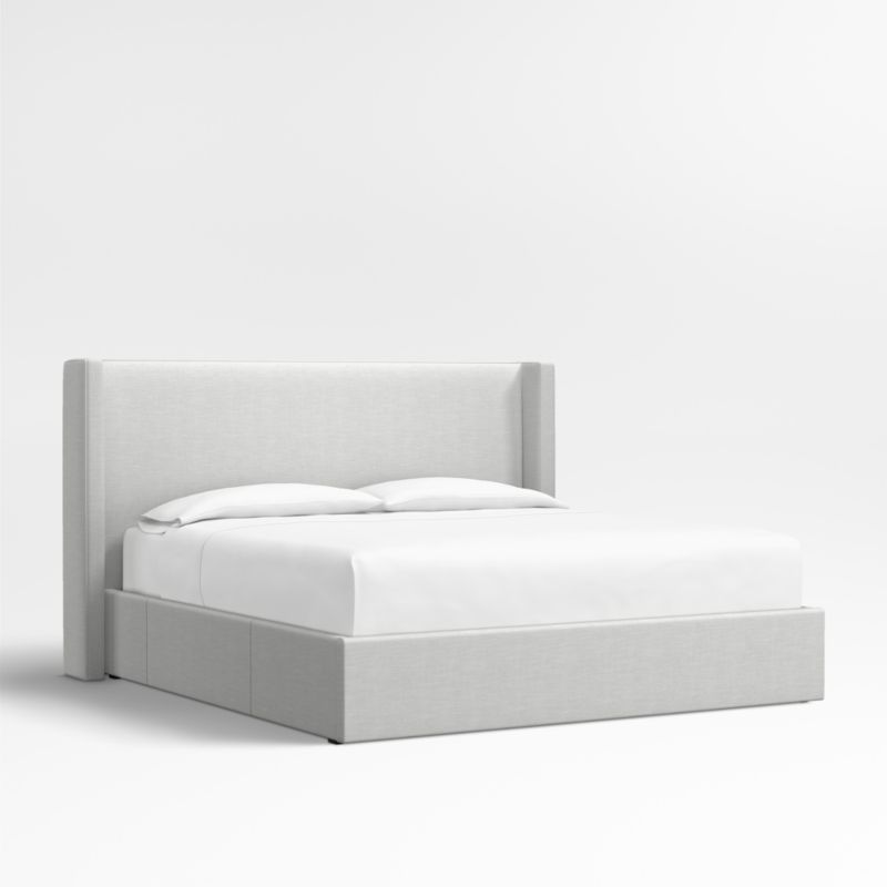 Our custom bed collection lets you mix and match our top-selling headboards and bases for a look that's truly yours. Fully upholstered in a cool grey linen blend, our Arden headboard and storage base are amply padded and neatly tailored with topstitching. The shelter headboard with wingback contours and comfy padding wraps onto the base, which integrates three roomy drawers—one on each side and one at the foot of the bed—for storing off-season clothes and extra blankets. As a plus, the side drawers open with just enough clearance to avoid hitting nightstands and other bedroom furniture.